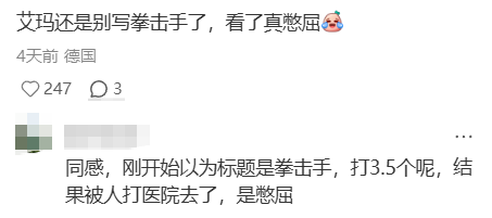 “还以为拳击手一人打三五个呢,结果被人打医院去了,憋屈。”