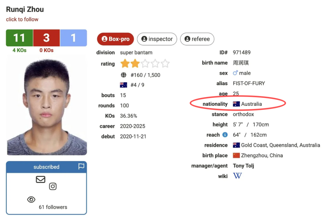 同时,还有人扒出周润琪在全球职业拳击数据库网站BoxRec上的资料,上面显示他的国籍为澳大利亚。